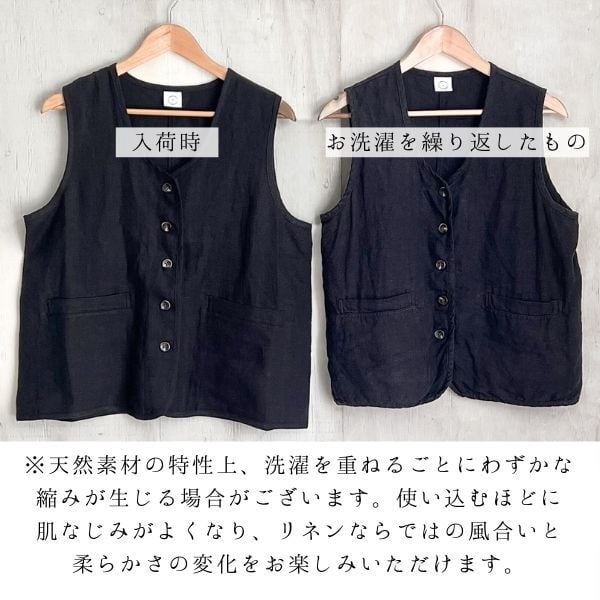 定番の9番手リネンを使用したシンプルなデザインで着回しやすいベストです。
