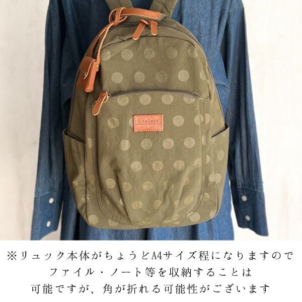 ※リュック本体がちょうどA4サイズ程になりますので、ファイル・ノート等を収納することは可能ですが、角が折れる可能性がございます