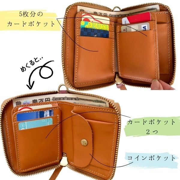カード、小銭、お札もすっきり入る縦型の設計で、収納力もバッチリ。