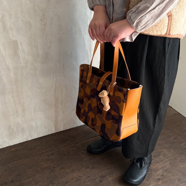迷彩柄のスタイルに、収納力と使いやすさをプラスしたトートバッグです。