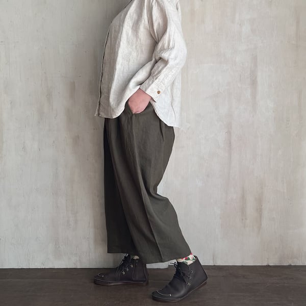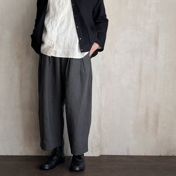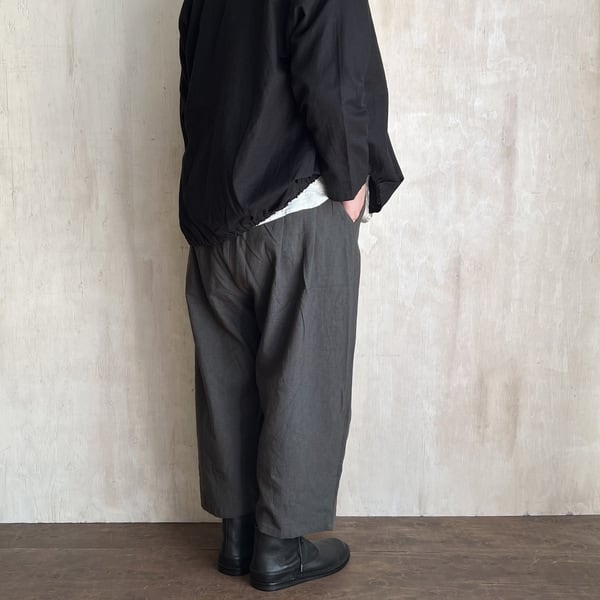 再生繊維・コットン・リネンをほどよくブレンドし、軽やかでしなやかな落ち感をいかした サルエル風タックパンツ です。