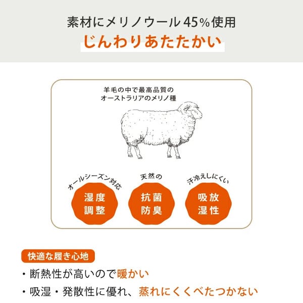 ウールがしっかりとあたたかさを保ちつつ、コットンがムレを抑え、季節の変わり目にも心地いい。