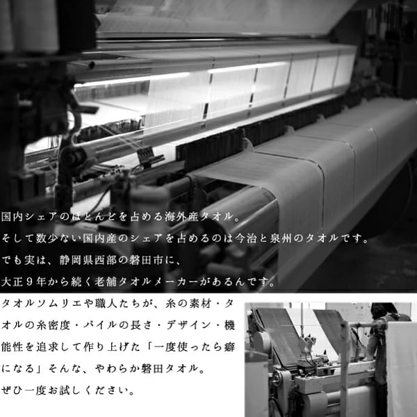 「made in 静岡磐田のふんわりやさしいタオル」を旗印に、タオルソムリエ・タオル職人たちが糸の素材・タオルの糸密度・パイルの長さ・デザイン・機能性を追求し、糸から織りあげて作り上げた「一度使ったら癖になる」タオルです。<br><br><br><br>