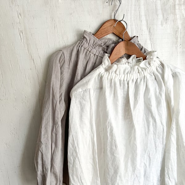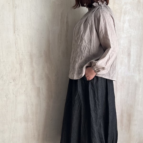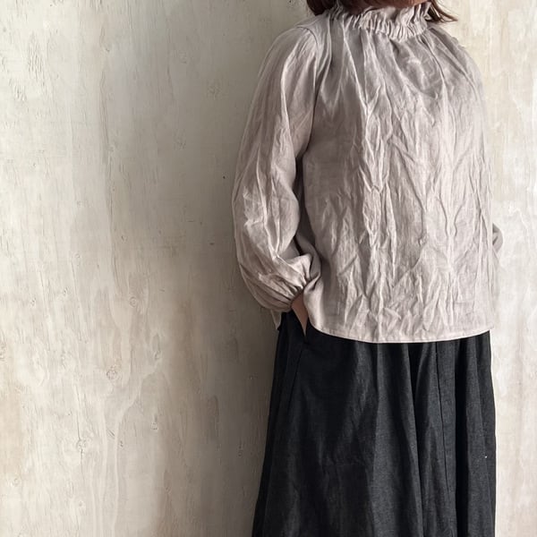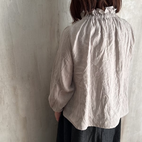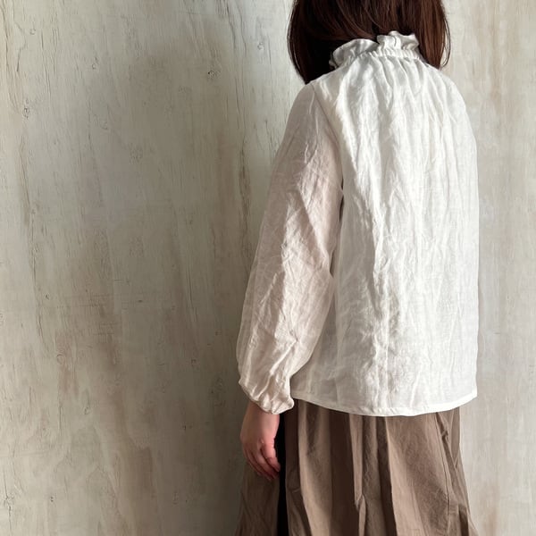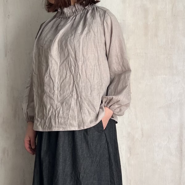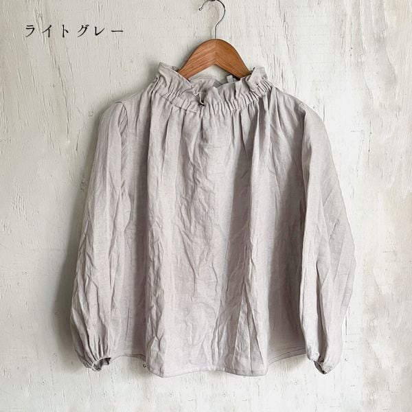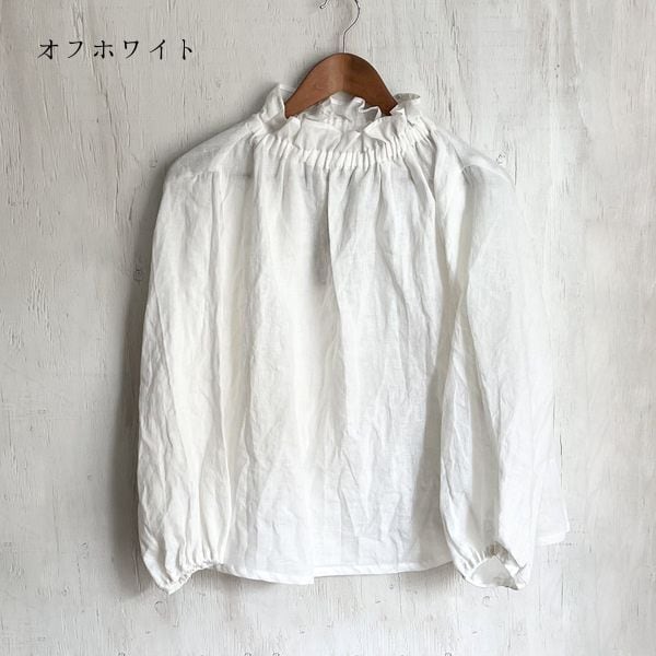 リネンゴム入りフリルネックブラウス