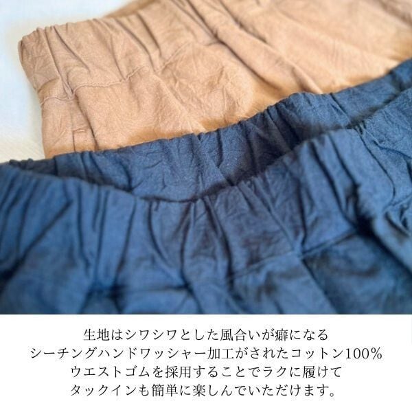 生地はシワシワとした風合いが癖になるシーチングハンドワッシャー加工がされたコットン100%。