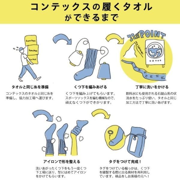 通常の靴下の生産工程には無い、このひと手間によって吸放湿性に優れた蒸れにくい、まるで『履くタオル』のようなやさしい履き心地の靴下が生まれました。